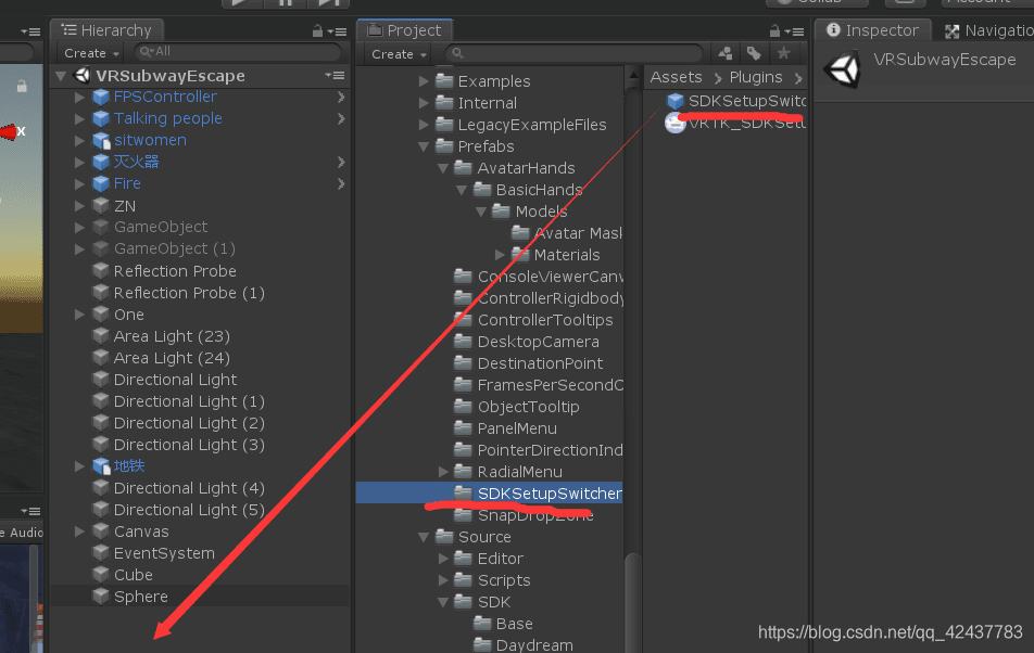 This project uses VRTK in conjunction with SteamVR to quickly configure the VR environment. Open the VRTK->Prefabs folder in the Plugins folder, find the SDKSetupSwitcher prefab, and drag it into the Hierarchy window: